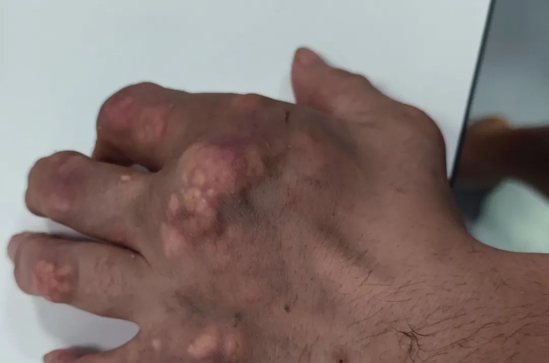 王先生是因为代谢问题,由于尿酸生成过多以及尿酸排泄很少,导致王先生的血尿酸值长期超标。王先生发生痛风后没有太过重视,以为自己只要吃了药就行了,结果王先生不仅不进行饮食控制和生活管理,就连吃药也是想起来才吃,这使得王先生痛风没几年就长出了痛风石。痛风石才出现时我建议王先生做手术清除,结果王先生还是我行我素,认为自己能控制好病情。4年时间中痛风石越长越大,几乎已经侵蚀了手部所以关节,现在想做手术也非常难,这时王先生才是真的后悔了。